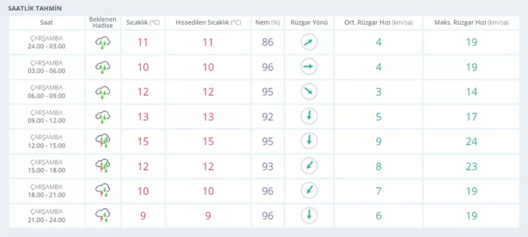Saatlik Detay: Öğle saatlerinde (12.00-15.00) yağış şiddetini artırırken, rüzgar hızı saatte 24 km'ye kadar çıkacak. Akşam saatlerinde nem oranı %96 seviyelerine ulaşarak oldukça yüksek bir doygunluğa erişecek.