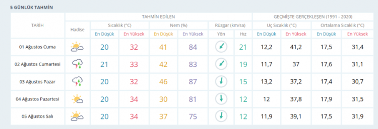 1 AĞUSTOS CUMA; En yüksek sıcaklık 32 derece, en düşük sıcaklık 20 derece