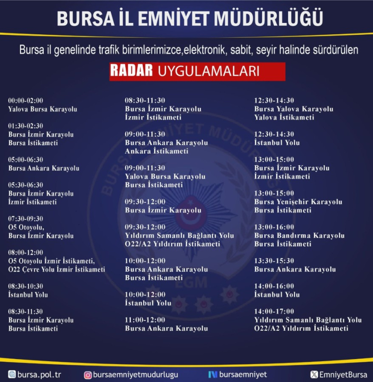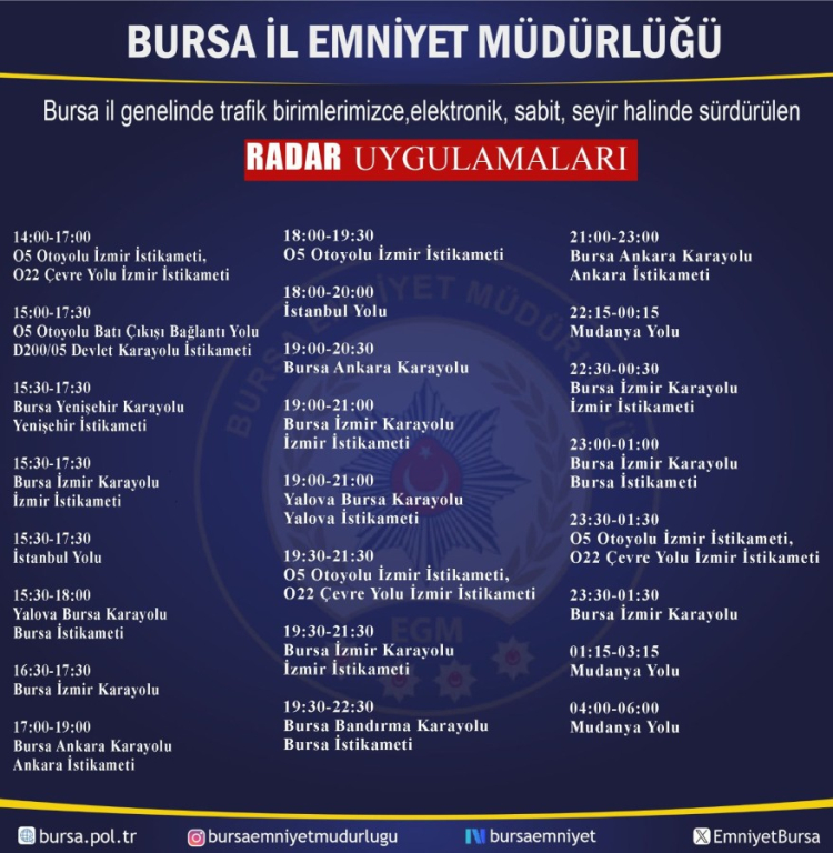 Bursa'da kent genelinde yapılcak olan radar uygulama noktaları Bursa Emniyet Müdürlüğü tarafından açıklandı.