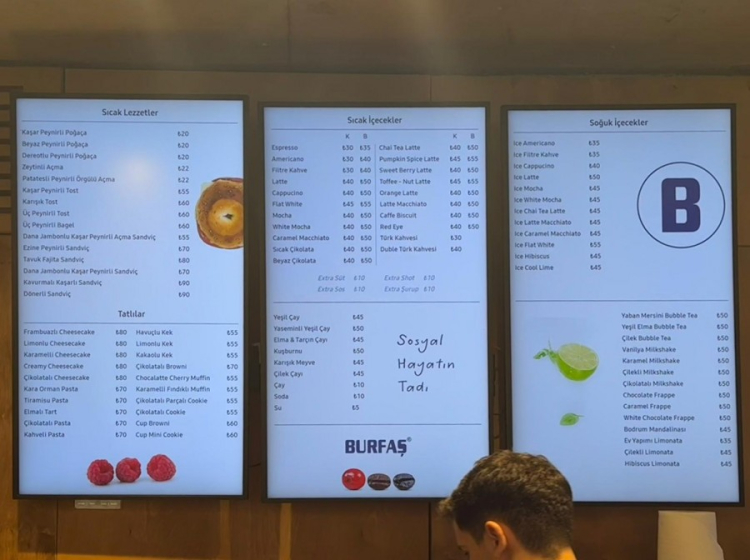 BURFAŞ Kafe, çeşitli içecek ve atıştırmalık seçenekleri sunuyor. Sıcak içecekler 30 TL ila 55 TL arası değişkenlik gösterirken soğuk içecekler 35 TL ila 55 TL arasında satışa sunuluyor. Yiyecek çeşitleri ise 20 TL ve 90 TL arası tezgahlarda yerini alıyor. Tatlı fiyatları en ucuz 55 TL en pahalı ise 80 TL'ye satılıyor. İşte BURFAŞ Kafe fiyatları şu şekilde;