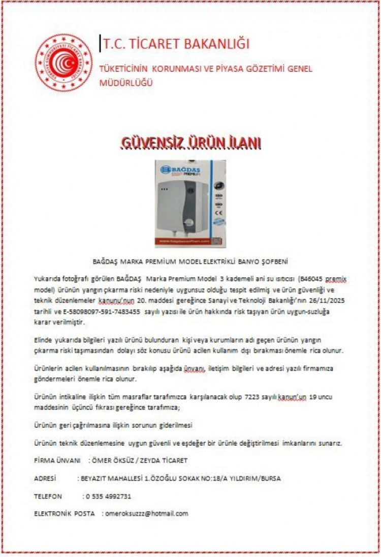 T.C. Ticaret Bakanlığı Tüketicinin Korunması ve Piyasa Gözetimi Genel Müdürlüğü, Bursa'da satışı yapılan 'BAĞDAŞ marka Premium Model 3 kademeli ani su ısıtıcısı (B64045 Premium model" için bir uyarı metni yayınladı.