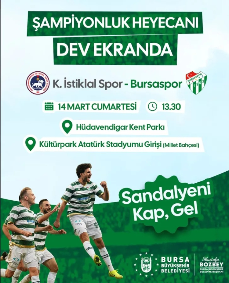 Bursa Büyükşehir Belediyesi, yeşil-beyazlı taraftarların maçı birlikte izleyebilmesi amacıyla Hüdavendigar Kent Parkı'na dev ekran kurulacağını açıkladı. Taraftarlar, kurulacak dev ekran sayesinde deplasmandaki mücadeleyi birlikte takip ederek takımlarına destek verecek.