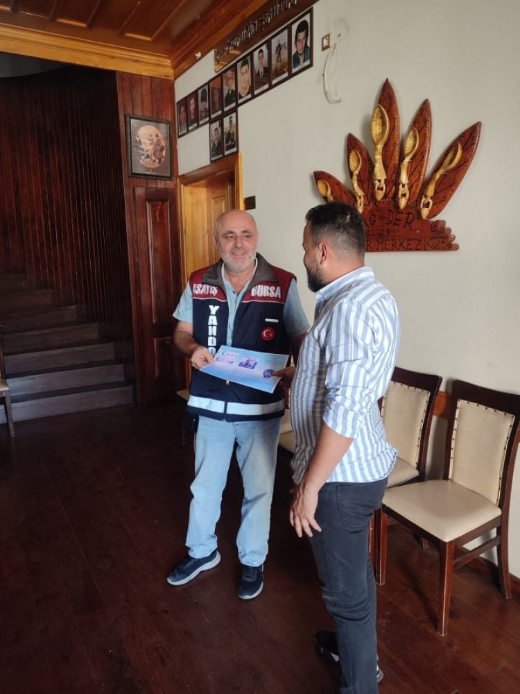 Bursa İl Emniyet Müdürlüğü Asayiş Şube Müdürlüğü Dolandırıcılık Büro Amirliği ekipleri, 13-14 Ağustos tarihlerinde Balkan Göçmenleri Derneği (BAL-GÖÇ), Muşlular Derneği (MUŞ-DER), Bursa Dağ Köyleri Derneği (DAĞ-DER) ve Erzurum Narmanlılar Derneği'ni ziyaret etti. Dernek yöneticileri ile yüz yüze görüşen ekipler, üyelerin dolandırıcılık yöntemlerine karşı bilinçlendirilmesi amacıyla bilgi verdi.