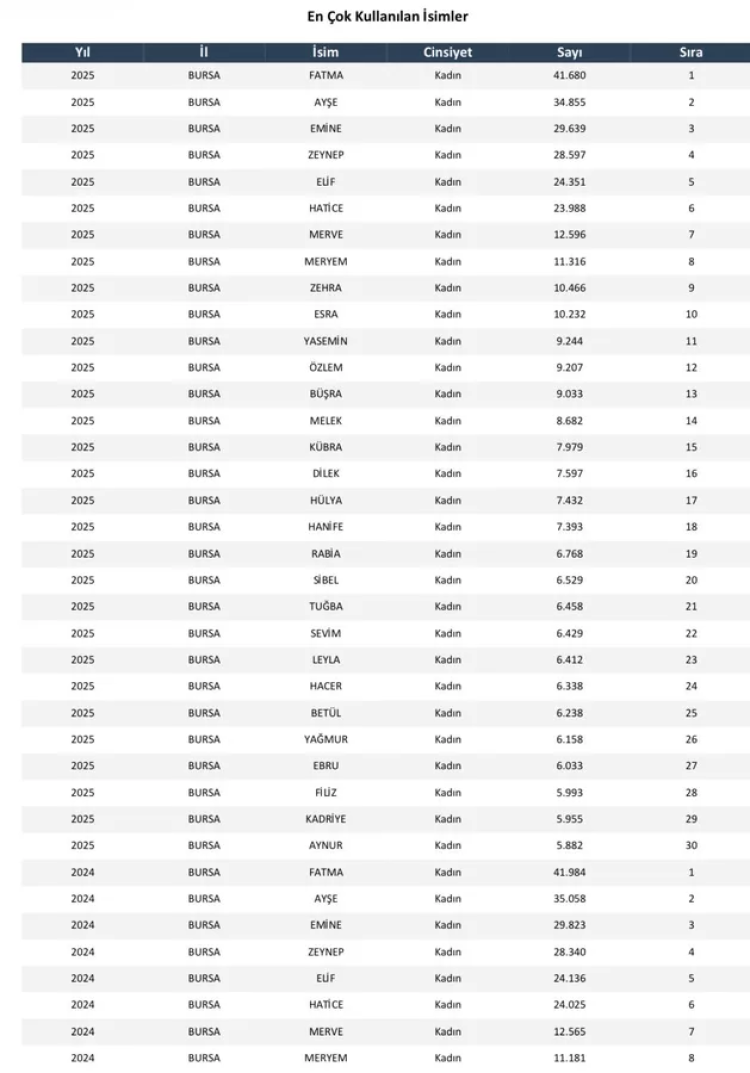 Türkiye İstatistik Kurumu'nun (TÜİK) 2025 yılı verilerine göre Bursa'da en çok kullanılan isimler netleşti. Açıklanan listeye göre, yıllardır popülerliğini koruyan geleneksel isimler yine listenin üst sıralarında yer aldı.
