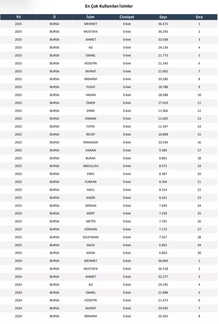 Bursa'da erkek isimleri arasında ilk sırayı 36 bin 373 kişiyle "Mehmet" aldı. Onu 36 bin 293 kişiyle "Mustafa" ve 32 bin 38 kişiyle "Ahmet" takip etti. Listede "Ali", "İsmail", "Hüseyin", "Murat", "İbrahim", "Yusuf" ve "Hasan" gibi isimler de öne çıktı.
