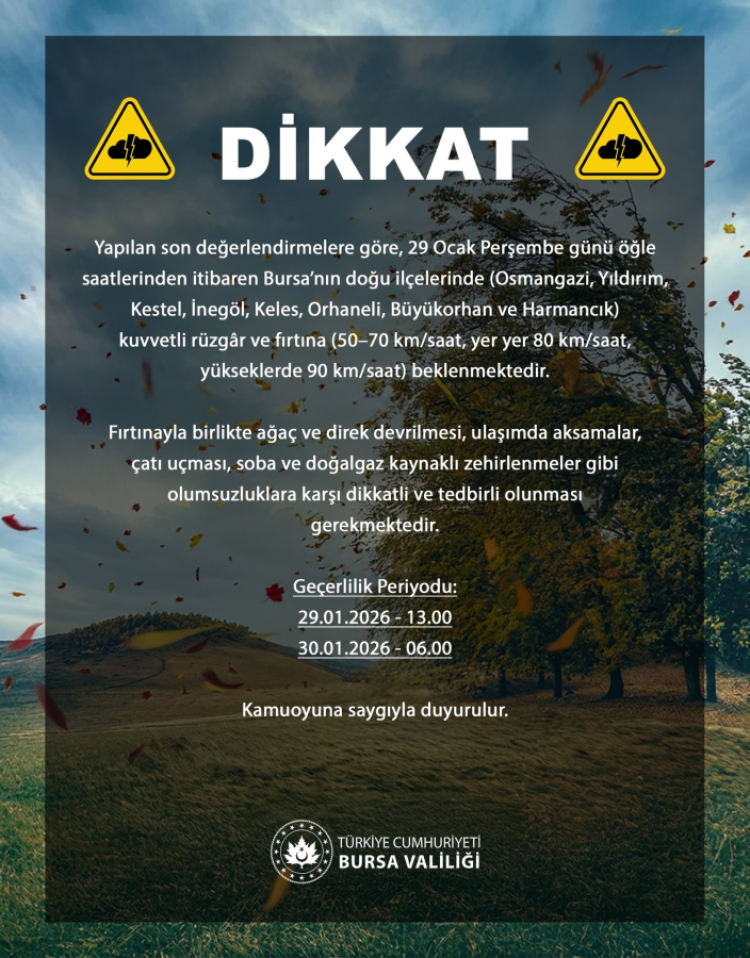 Yapılan son değerlendirmelere göre, 29 Ocak Perşembe günü öğle saatlerinden itibaren Bursa'nın doğu ilçelerinde (Osmangazi, Yıldırım, Kestel, İnegöl, Keles, Orhaneli, Büyükorhan ve Harmancık) kuvvetli rüzgâr ve fırtına