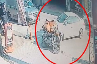 Bursa'da, otomobil ile motosikletin çarpıştığı kaza güvenlik kamerasına yansıdı. Motosikleti ile otomobil arasına sıkışan kuryenin yardımına çevredekiler koştu.