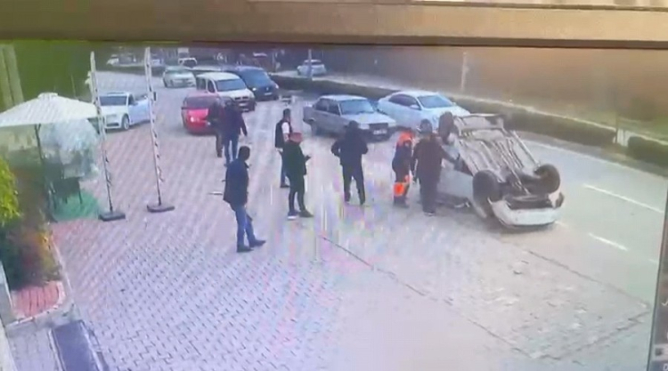 Bursa'nın İnegöl ilçesinde refüje çarpıp takla atan otomobilin yaralanan sürücüsü araçtan kendi imkanlarıyla çıktı. Kaza, çevredeki bir iş yerinin güvenlik kamerasına yansıdı.