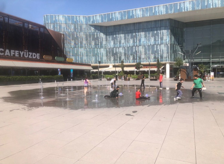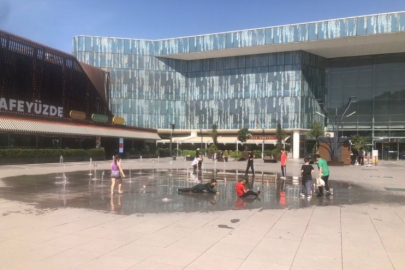 Bursa'nın sıcak havasında serinlemek ve eğlenceli zaman geçirmek isteyen çocuklar, Osmangazi ilçesindeki Kent Meydanı'nda bulunan fıskiyeleri çözüm olarak gördü.