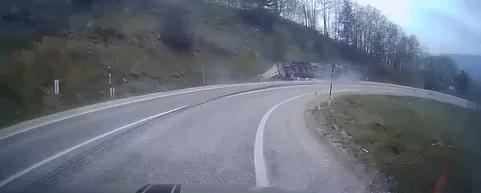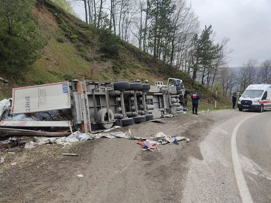 Öte yandan kaza, bir başka aracın kamerasına yansıdı. Görüntülerde viraja hızla giren TIR'ın devrildiği görüldü.
