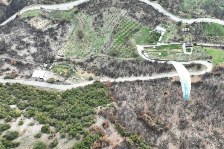 Hazırlanan tohum topları, Dışkaya Mahallesi Yamaç Paraşütü Uçuş Alanı'ndan havalanan gönüllü yamaç paraşütü pilotlarınca geçen temmuz ayında yanan bölgeye serpildi.