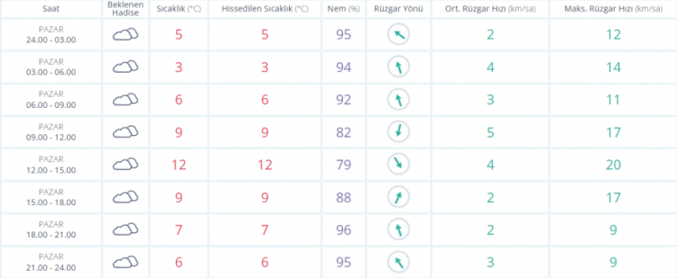 Pazar günü nem oranı oldukça yüksek seyredecek ve yüzde 79 ile 96 arasında değişecek. Rüzgâr genellikle hafif esecek, ortalama rüzgâr hızı 2-5 km/sa arasında olurken, zaman zaman saatte 20 kilometreye kadar ulaşan hamleler görülebilecek.
