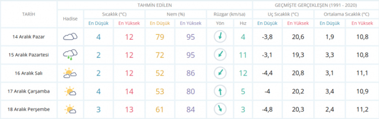 14 Aralık Pazar: Çok bulutlu, en düşük 4, en yüksek 12 derece.15 Aralık Pazartesi: Yağışlı hava etkili olacak. Sıcaklık 2 ile 12 derece arasında seyredecek.16 Aralık Salı: Parçalı bulutlu, en düşük 2, en yüksek 12 derece.17 Aralık Çarşamba: Parçalı bulutlu, sıcaklık 4 ila 14 derece arasında olacak.18 Aralık Perşembe: Az bulutlu bir gün bekleniyor. En düşük sıcaklık 3, en yüksek sıcaklık 13 derece.