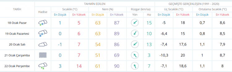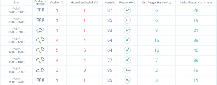 Pazar günü gece ve sabah saatlerinde sis ve pus etkili olurken, sabah erken saatlerde yer yer karla karışık yağmur görülecek. Gün içinde yağmur beklenirken sıcaklık 1 ila 5 derece arasında seyredecek. Rüzgâr zaman zaman kuvvetlenerek 40 km/sa hıza ulaşabilecek. Gece saatlerinde yeniden sis bekleniyor.