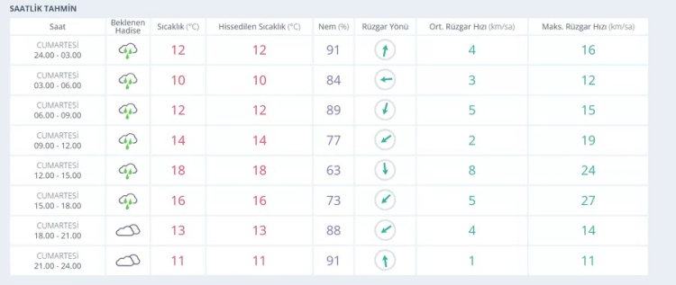 Pazar günü de sağanak yağış devam ediyor. Sıcaklıklar 10°C ile 16°C arasında değişirken, rüzgar hızının artarak 14 km/sa seviyelerine ulaşması bekleniyor. Nem oranı ise %96 ile haftanın zirvesine ulaşacak.