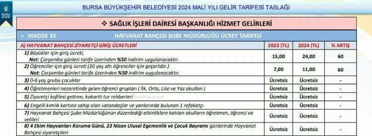Yılda bir milyonu aşkın vatandaşın ziyaret ettiği Bursa Hayvanat Bahçesi giriş ücretlerine 2024 yılı itibarıyla geçerli olacak şekilde yüzde 60 oranında zam yapılacağı öğrenildi.
