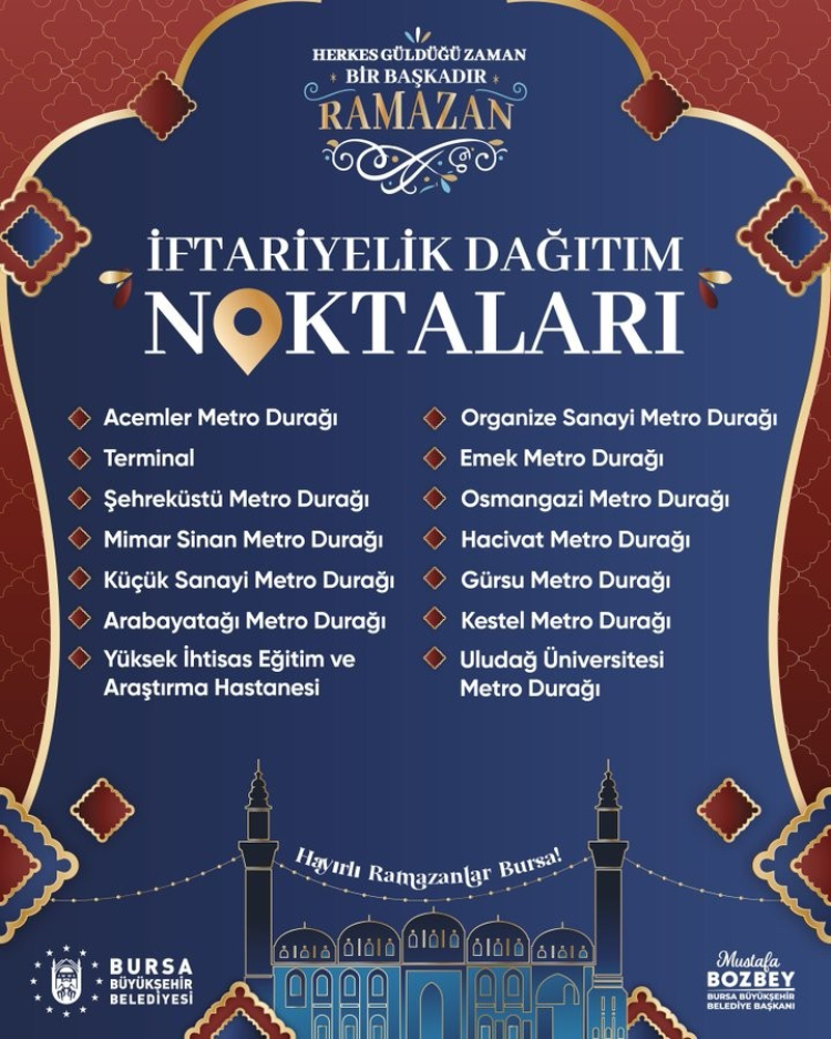 Ücretsiz dağıtım yapılacak noktalar arasında Acemler, Emek, Hacivat, Küçük Sanayi, Arabayatağı, Gürsu ve Kestel metro durakları ile Terminal ve Şehreküstü çevresi öne çıkıyor. Ayrıca Yüksek İhtisas Eğitim ve Araştırma Hastanesi çevresinde de iftariyelik verilecek.
