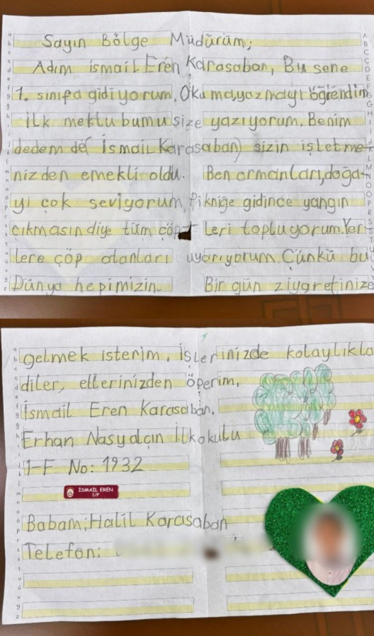 Bursa'da ilkokul 1. sınıf öğrencisi İsmail Eren Karasaban, okuma yazma öğrenir öğrenmez ilk mektubunu dedesinin emekli olduğu Orman Bölge Müdürlüğü'ne yazdı. "Dünya hepimizin" diyen minik çevrecinin mektubuna, Bursa Orman Bölge Müdürü Erdal Şahan'dan cevap geldi.