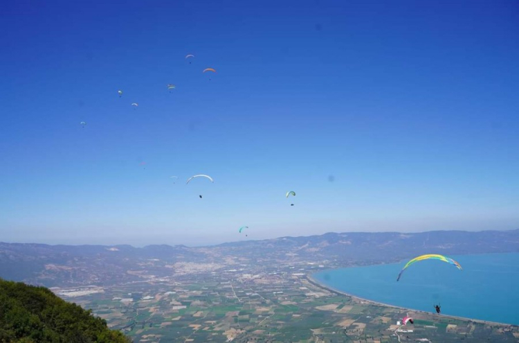 Hava değerlerinin de uçuşa müsait olması ile birlikte Gürle Dağı'ndan atlayan paraşütçüler gökyüzünde görsel şölen oluştururken, İznik gölü semaları onlarca yamaç paraşütü ile doldu.