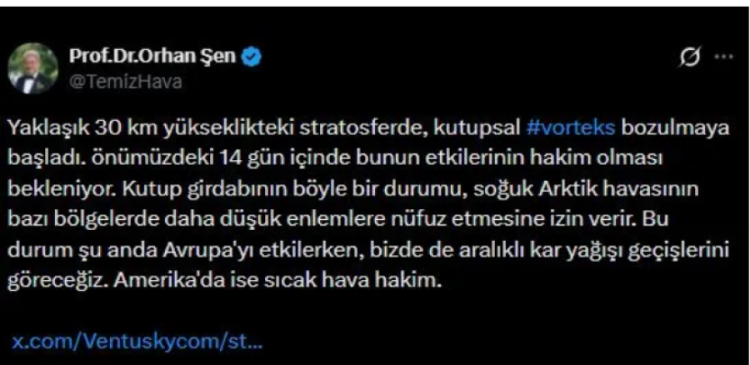 "Yaklaşık 30 km yükseklikteki stratosferde, kutupsal vorteks bozulmaya başladı. Önümüzdeki 14 gün içinde bunun etkilerinin hakim olması bekleniyor. Kutup girdabının böyle bir durumu, soğuk Arktik havasının bazı bölgelerde daha düşük enlemlere nüfuz etmesine izin verir. Bu durum şu anda Avrupa'yı etkilerken, bizde de aralıklı kar yağışı geçişlerini göreceğiz.