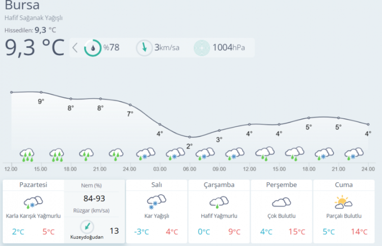 Meteoroloji Genel Müdürlüğü (MGM), pazartesi ve salı günleri için 55 ilde kuvvetli kar yağışı uyarısında bulunurken, kar beklenen şehirler arasında Bursa'nın da yer aldığı bildirildi. Uzmanlar, olumsuz hava koşulları nedeniyle haftanın ilk iki gününde okulların tatil edilebileceğini açıkladı.