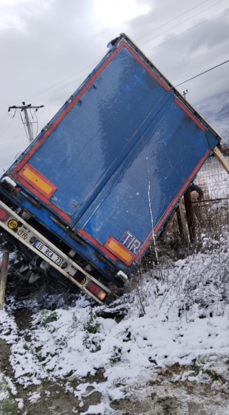 Bursa'da İznik - Orhangazi yolu üzerinde dün gece meydana gelen trafik kazasında karlı havada sürücünün kontrolünden çıkan bir tır yol kenarına devrildi. Kazadan sürücü yara almadan kurtulurken, devrilen tır ekiplerin uzun süren çalışmaları ile kaldırıldı.