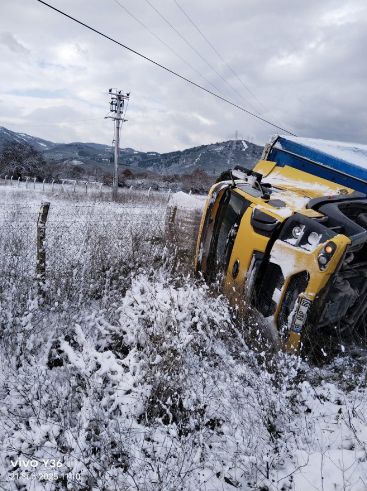 Olay dün gece Orhangazi - İznik güney yolu üzeri Gemiç Mahallesi Kavşağı yakınlarında meydana geldi. Alınan bilgilere göre İznik'ten Orhangazi yönüne gitmekte olan bir tır yoğun kar yağışı nedeniyle kayganlaşan yolda sürücünün kontrolünden çıktı ve yol kenarına savrularak devrildi.