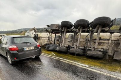 Bursa'da İznik - Adapazarı yolu üzerinde meydana gelen trafik kazasında, kontrolden çıkan tır devrildi. Kazadan sürücü hafif sırıklarla kurtulurken, arkasında bulunan tavuk yağı yüklü tanker yerinden çıkarak savruldu.