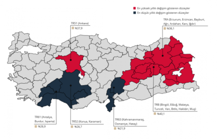 İstatistiki Bölge Birimleri Sınıflaması'na göre yıllık değişimler incelendiğinde, Kasım 2025'te en yüksek yıllık artış yüzde 40,1 ile Bingöl, Elazığ, Malatya, Tunceli, Van, Bitlis, Hakkâri ve Muş illerini kapsayan bölgede görüldü. En düşük yıllık artış ise yüzde 21,9 ile Hatay, Kahramanmaraş ve Osmaniye illerinin yer aldığı bölgede kaydedildi.