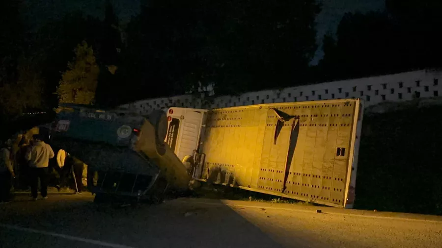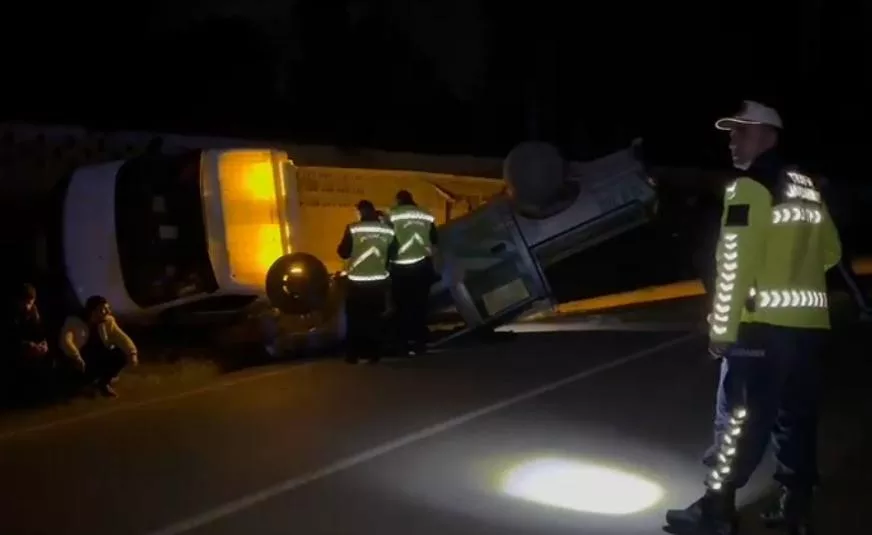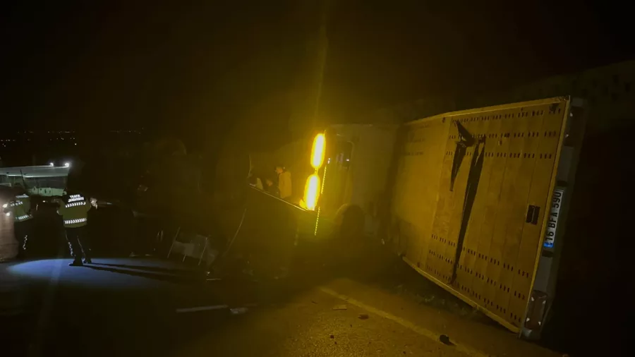 Edinilen bilgilere göre, 16 BFA 590 plakalı çekici kamyon, sürücüsünün direksiyon hâkimiyetini kaybetmesi sonucu kontrolden çıkarak devrildi.