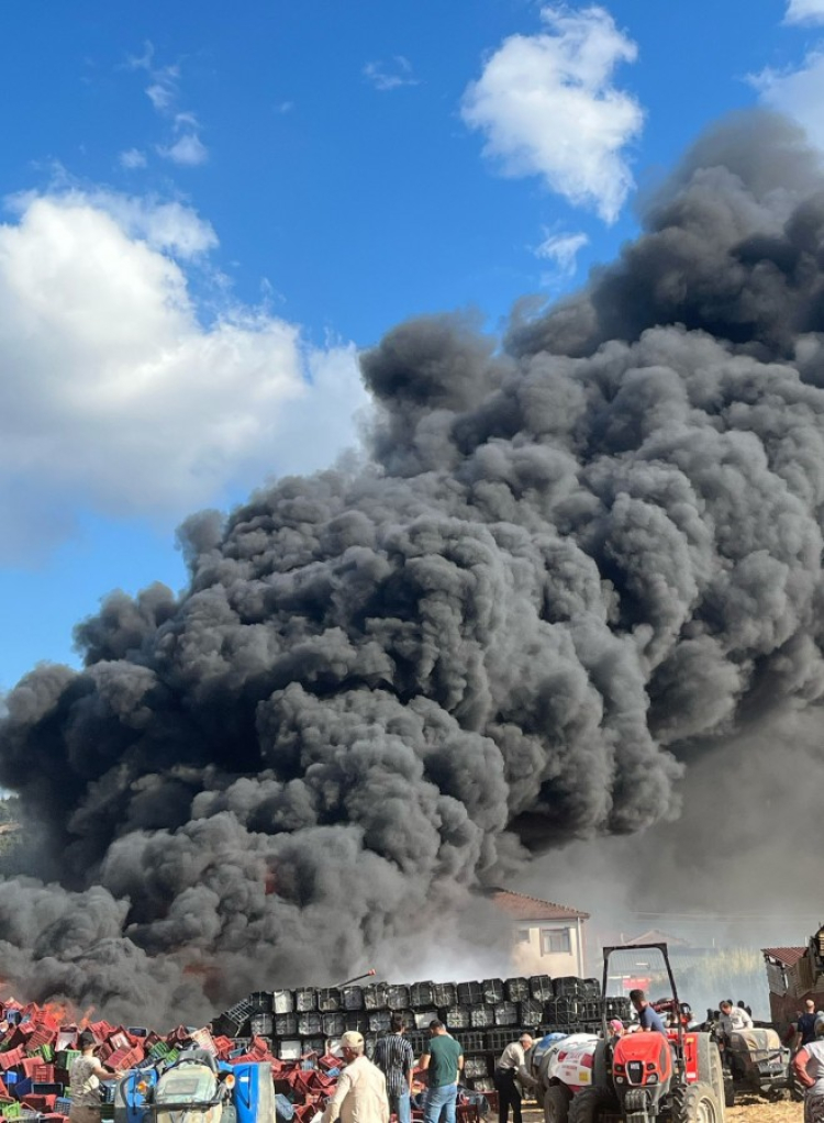 Nedeni henüz belirlenemeyen bir sebeple depo bahçesinde bulunan plastik kasalar alev aldı.