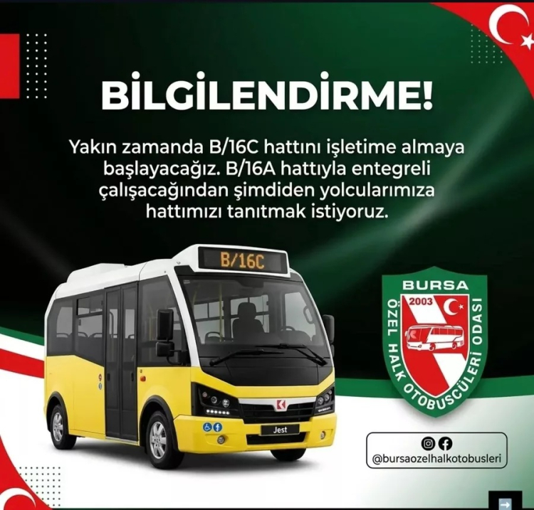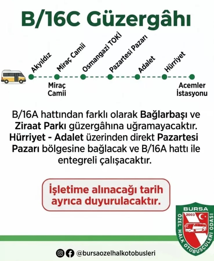 Bursa Özel Halk Otobüsleri tarafından yapılan duyuruya göre, B/16C hattı hizmete alınacak. Yeni hat; Akyıldız, Miraç Camii, Osmangazi TOKİ, Pazartesi Pazarı, Adalet ve Hürriyet güzergâhını takip ederek Acemler İstasyonu'na varacak.