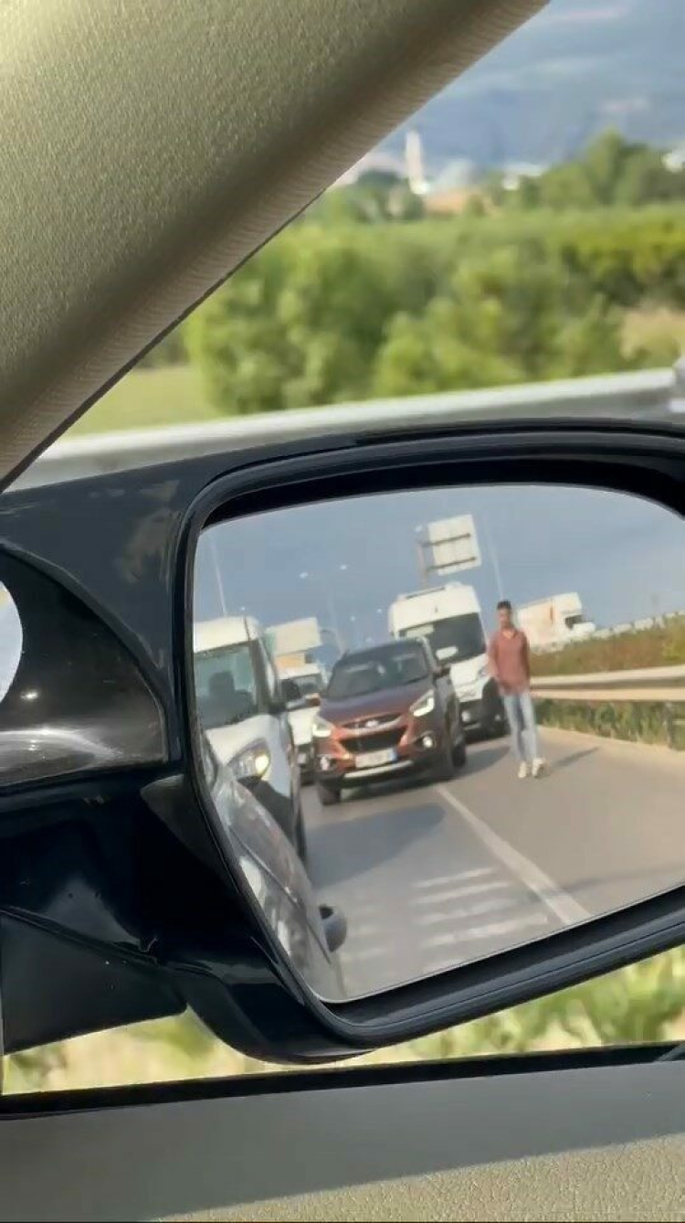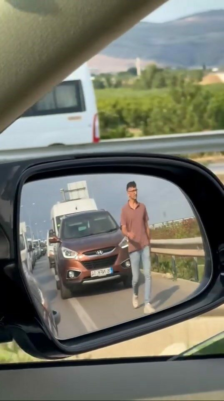 Bunu gören bir vatandaş ise, bulunduğu araçtan inerek emniyet şeridinden yürümeye başladı.