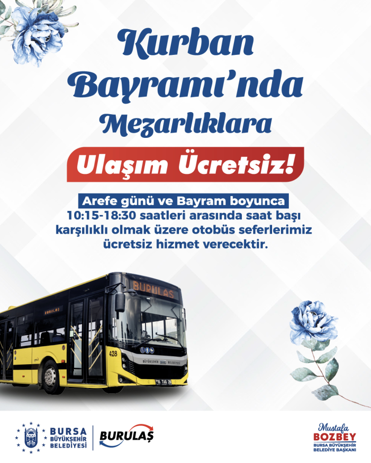 Bursa Büyükşehir Belediyesi, Kurban Bayramı’nda vatandaşların rahat ve huzurlu bir şekilde ziyaretlerini gerçekleştirebilmeleri amacıyla 6-9 Haziran tarihleri arasında BursaRay, tramvay ve tüm otobüslerin BursaKart kullanmak suretiyle ücretsiz olacağını açıkladı. Uygulama, kent içi ayakta yolcu taşıyan hatlarda geçerli olacak.