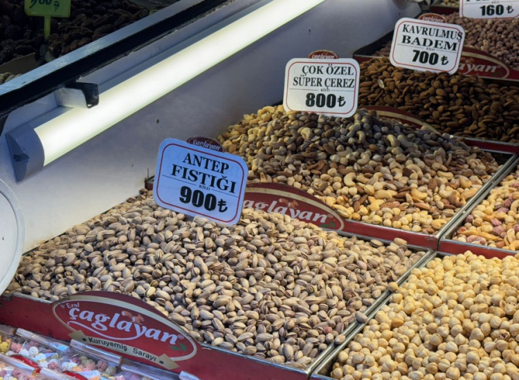 Kuruyemiş tezgahlarının en değerlisi Antep fıstığı ve Siirt fıstığı oldu. Kilosu 900 TL'den satışa sunulan Antep ve Siirt fıstıklarının ardından içinde kaju ve Antep fıstığının da bulunduğu süper özel karışık çerez ise kilosu 800 TL'ye alıcısını bekliyor.