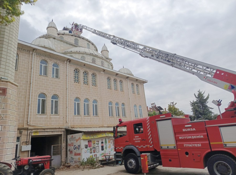 Bursa'nın İznik ilçesine bağlı Orhaniye köyünde, cami kubbesindeki yuvasında mahsur kalan leylek, itfaiye ekiplerinin üçüncü denemesinde kurtarılabildi.