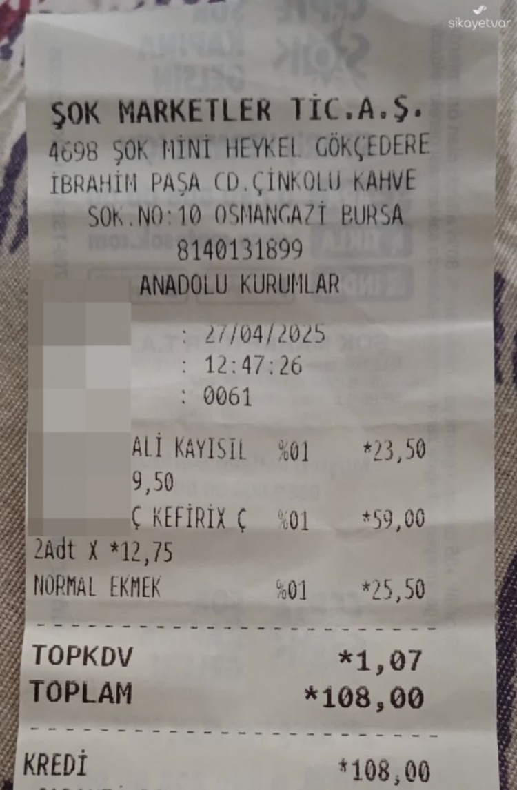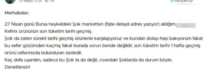 Bursa'nın Osmangazi ilçesinde Heykel'deki Şok Market'ten kefir alan vatandaş, aldığı ürünün son tüketim tarihinin geçmiş olduğunu gördü.