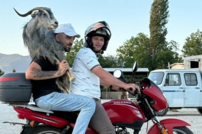 Bursa'da motosikletin üstünde 2 kişi ve 1 keçi!