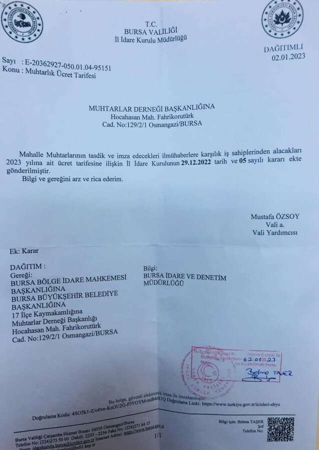 Bursa Valiliği muhtarlık işlemlerinin yeni bedellerini açıkladı.