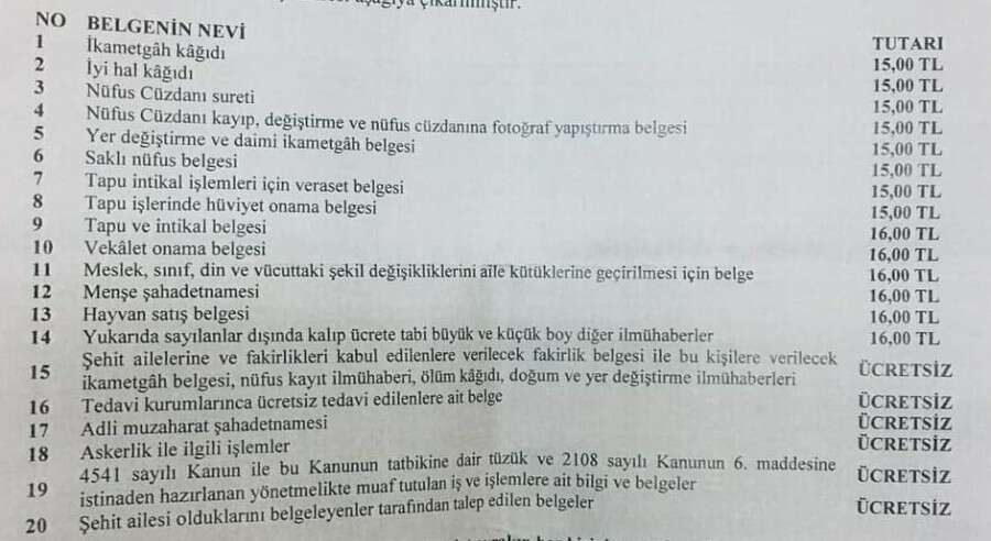 Nüfus cüzdanı kayıp, değiştirme ve nüfus cüzdanına fotoğraf yapıştırma belgesi 15 lira