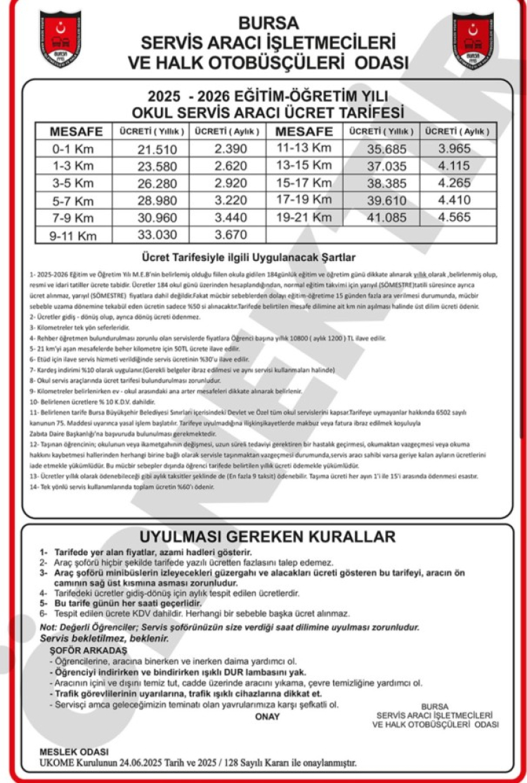 Bursa'da 2026 eğitim ve öğretim yılı okul servis aracı ücret tarifesi açıklandı. Yeni tarifeye göre servis ücretleri mesafeye göre yeniden belirlendi.