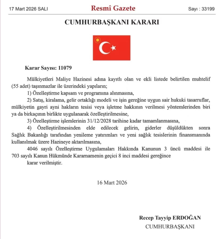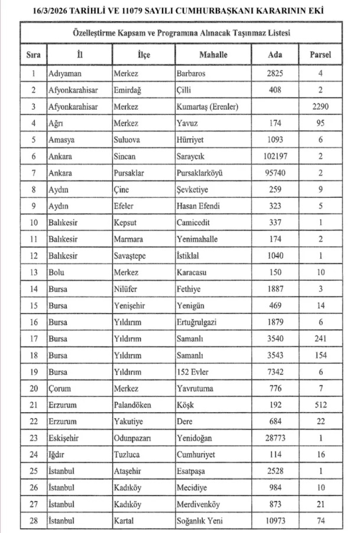 Resmi Gazete'de yayımlanan Cumhurbaşkanı Kararı ile Türkiye genelinde 55 taşınmaz özelleştirme kapsamına alındı. Listede Bursa'nın 3 farklı ilçesindeki 6 taşınmaz da yer alırken, elde edilecek gelirin sağlık yatırımlarında kullanılacağı açıklandı.