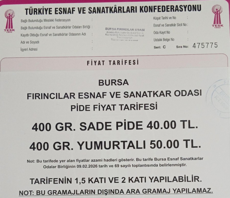 Bursa Fırıncılar Esnaf ve Sanatkârlar Odası, Ramazan ayına özel pide fiyat tarifesini duyurdu. 400 gram sade pide 40 TL, yumurtalı pide ise 50 TL'den satılacak.