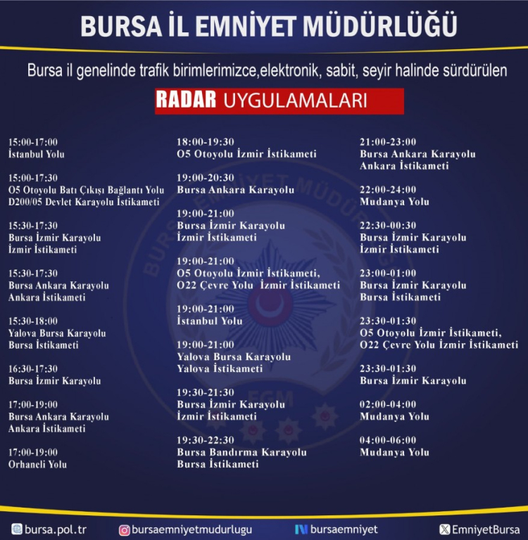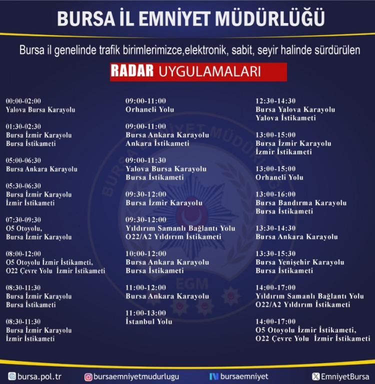 Bursa Emniyet Müdürlüğü radar uygulamalarının yerlerini paylaşarak, sürücüleri hız limitlerine uymaları ve trafik güvenliğini tehlikeye düşürmemeleri konusunda uyardı.