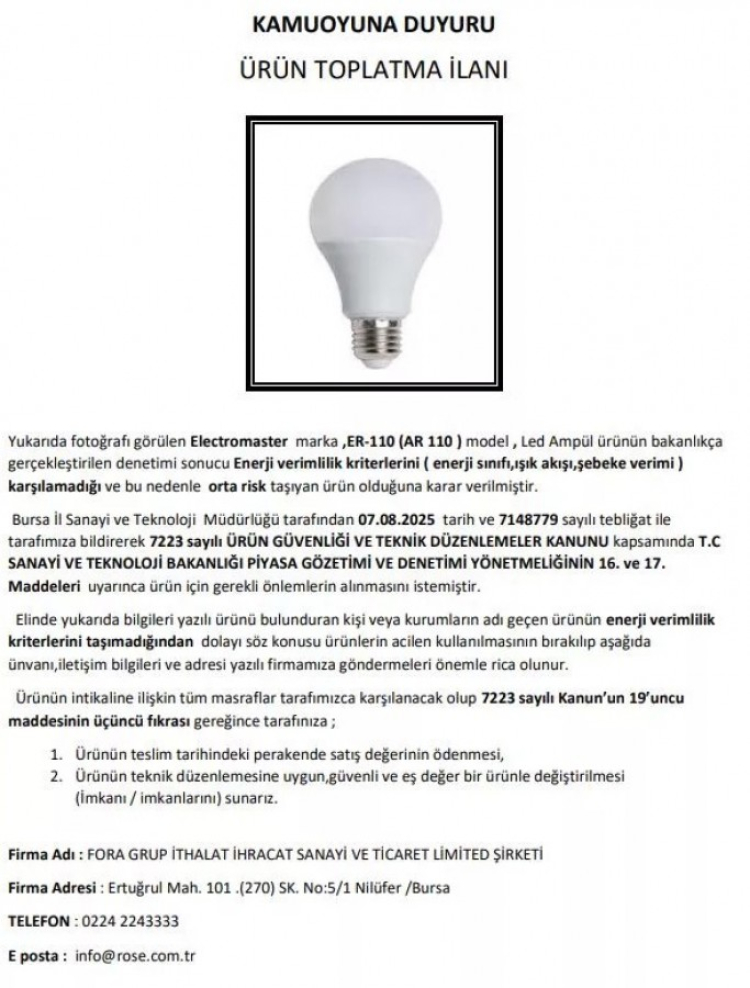 Bursa İl Sanayi ve Teknoloji Müdürlüğü, Electromaster markasına ait LED ampulleri, enerji verimliliği sınıfı, ışık akışı ve şebeke verimi gibi kriterleri karşılayamadığı için güvenli bulmadı. Yapılan denetimlerde ürünün "orta risk" taşıdığı belirtilerek piyasadan toplatılmasına karar verildi.