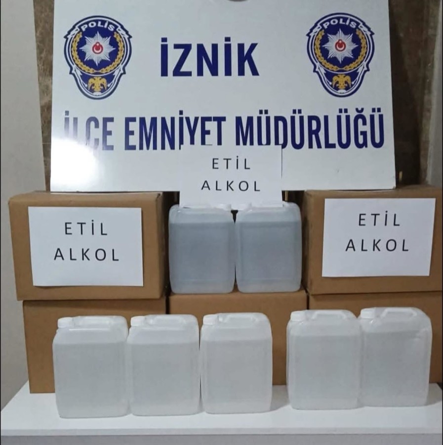Bursa'nın İznik ilçesinde ilçe emniyet müdürlüğü ekiplerince seyyar bir manava düzenlenen operasyonda piyasaya sürülmeye hazır 135 litre etil alkol ele geçirildi.