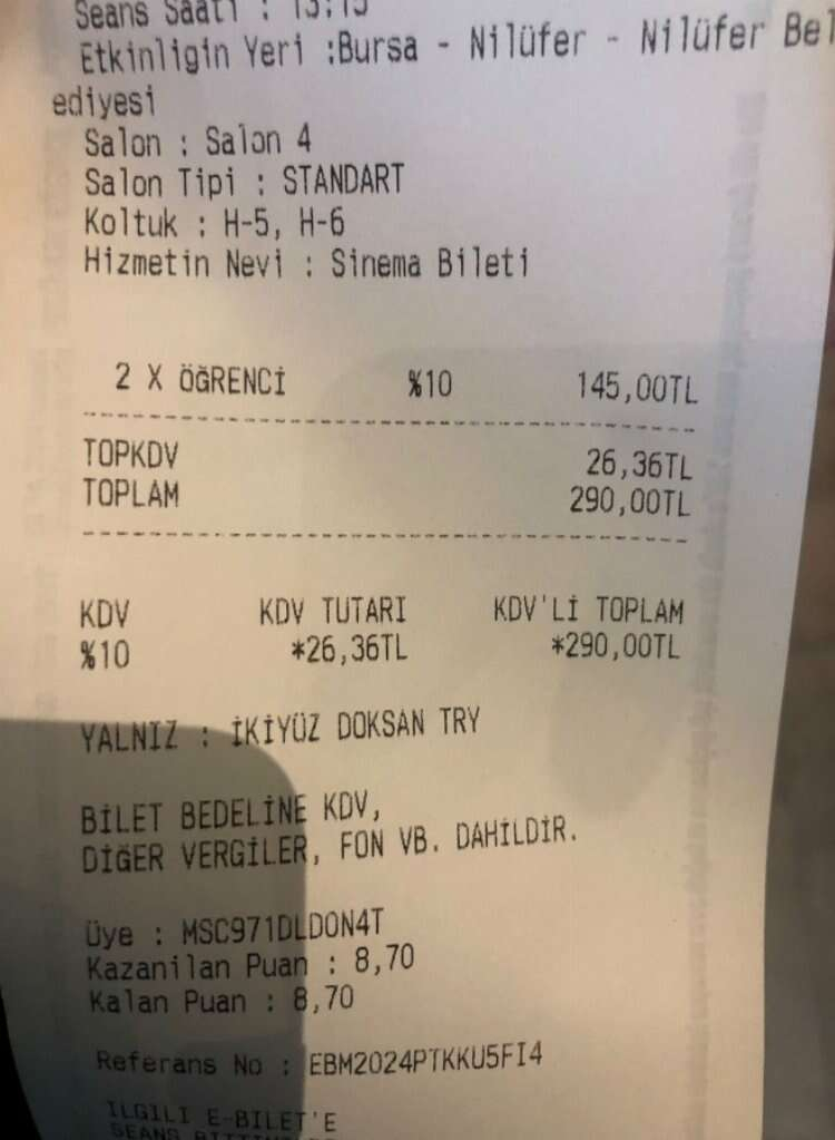 Sosyal aktivitelerin birincil mekanlarından biri sayılan sinemaya vatandaş artık gidemez hale geldi. Bursa Sur Yapı Marka AVM'de hafta sonu öğrenci ücreti 145 lira olarak satışa sunuldu. Kültürel ve eğlence amaçlı harcamalar vatandaşlar için lüks hale geldi.