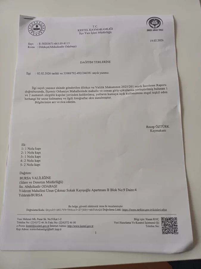 Kestel Kaymakamlığı tarafından hazırlanan resmi yazı doğrultusunda, mahalle ve orman giriş-çıkışlarına yerleştirilen iki sürgülü demir kapının yerinden kaldırıldığı bildirildi. Yazıda, yolların kamuya açık kullanımını engelleyen herhangi bir unsurun kalmadığı belirtildi.