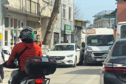 Bursa'nın Yıldırım ilçesi Kurtbasan Caddesi üzerinde bir sürücü iki şeritli yolda kimseyi umursamayıp, otomobili yola bıraktı. Bir süre sonra geçiş yapamayan araçlar metrelerce trafik oluşturdu.