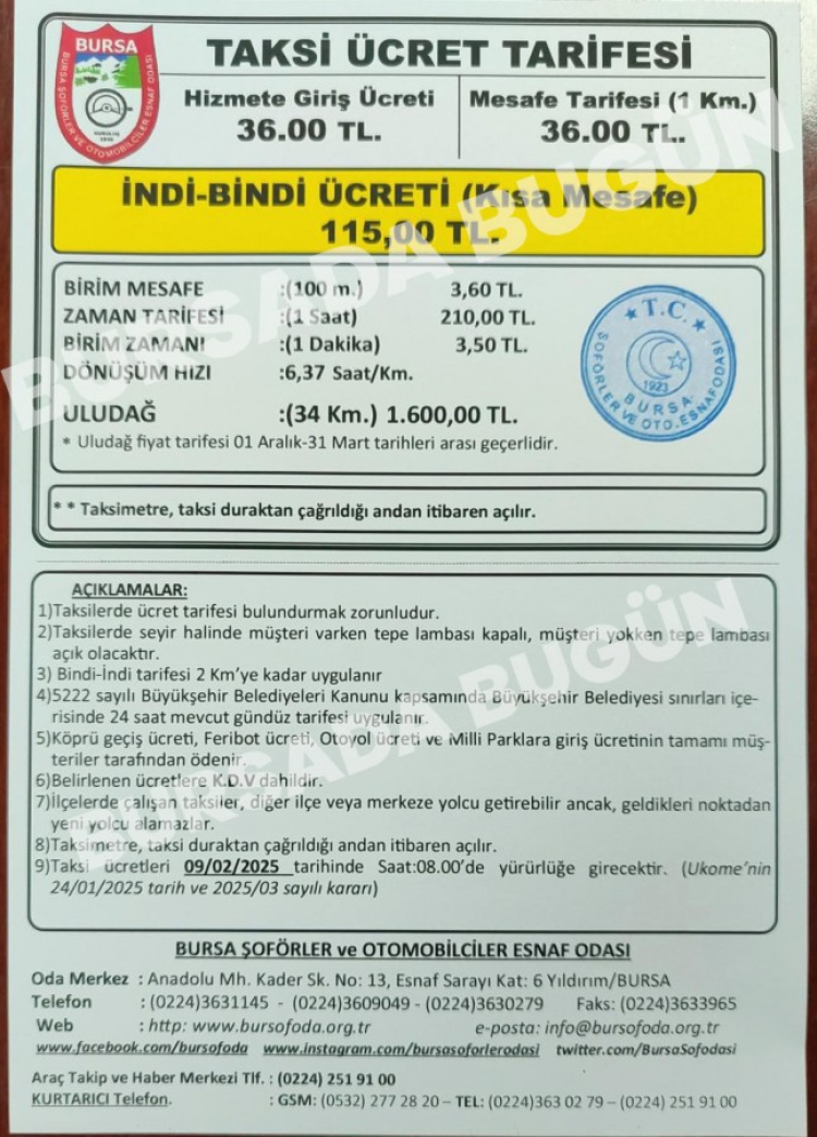 BURSA'DA TAKSİ ÜCRETLERİ NE KADAR OLACAK?